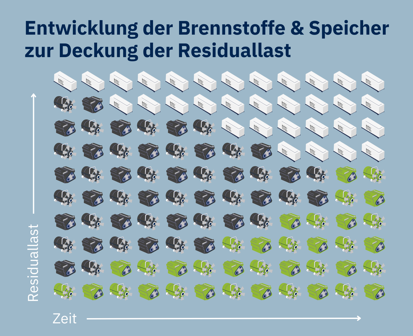 Today, we have an energy mix in Germany consisting of renewable energies and (still) coal and natural gas-fired power plants. In the medium and long term, it makes sense to distinguish between Technologies on the one hand and energy sources on the other hand. Just as turbines and motors are available as back-up today, storage systems will increasingly fulfil this role in the future. What will change is the amount of energy stored and the fuel.